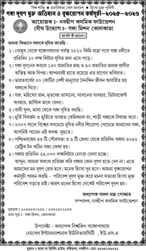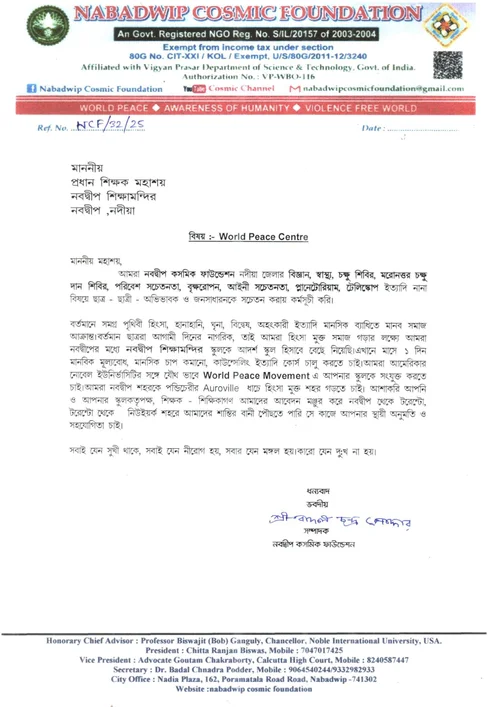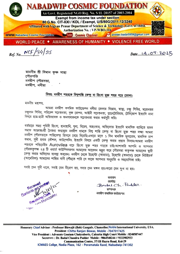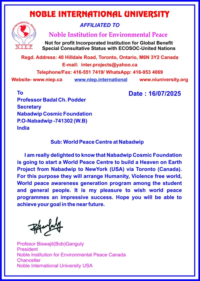 On July 16, 2025, Professor Biswajit (Bob) Ganguly, President of the Noble Institution for Environmental Peace and Chancellor of Noble International University USA, extended his congratulations to Professor Badal Ch. Podder, Secretary of Nabadwip Cosmic Foundation, for initiating the establishment of a World Peace Centre in Nabadwip, West Bengal, India.