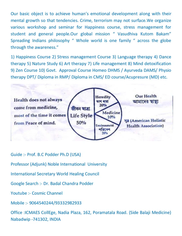 - TO Aiming to build up research & Development (R&D) centre for advance medical research with a valued approach in Holistic & Complementary medicine emphasizing mainly to corona, cancer, diabetes, strokes etc and other ailments.